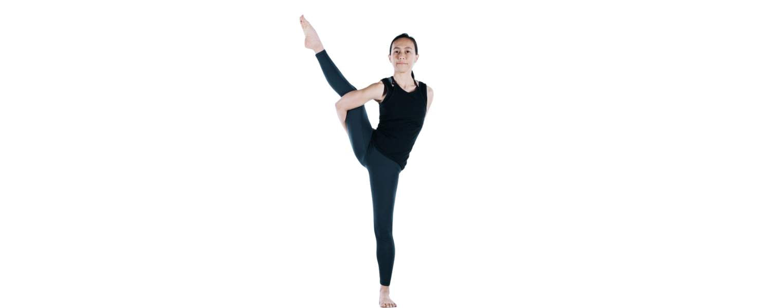 As you rise, focus on outwardly rotating your right hip and extending the lifted leg to the side. Lengthen your waist to evenly align your torso and open your chest, reaching your sternum away from your navel.